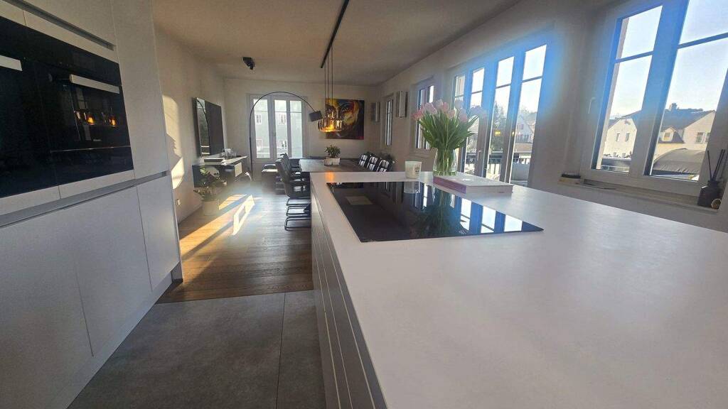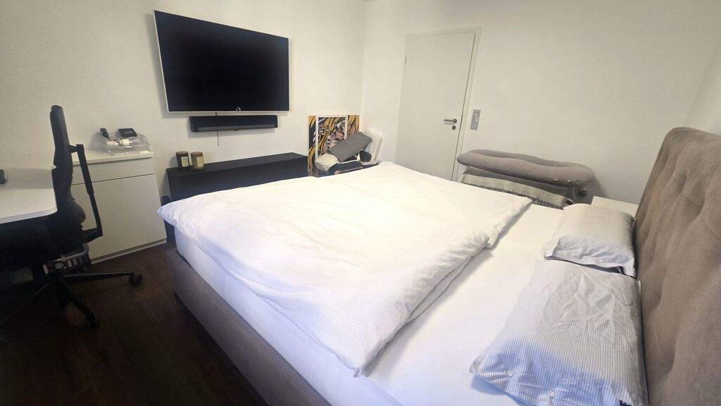 Hier erwartet Sie viel Sonnenlicht dank großer, tiefer Fenster, eine gehobene Ausstattung mit einer top ausgestatteten Küche, hochwertigem, modernen Bad mit riesen Dusche und teilmöbliert mit Balkonlounge, Sofa, Esszimmer und weiteren Möbeln + Hifi Sorround Sound System. Dank der guten Ausrichtung der Wohnung haben Sie im Wohn- Esszimmer + Küche und auf dem Balkon den ganzen Tag Sonne.
