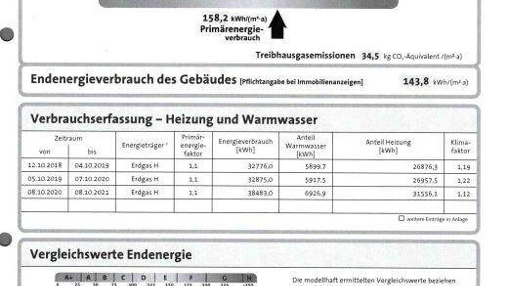Energieausweis Bedarfsausweis Effizienzklasse E Energiebedarf 143,8 kWh/m²a Wesentlicher Energieträger Gas Baujahr Wärmeerzeuger 1992
