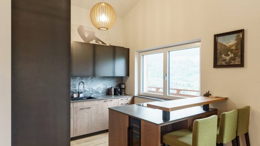 Beim Betreten der Wohnung gelangt man direkt in den Masterbedroom, welcher mit einem großzügigen Badezimmer ausgestattet ist. Der Wohnessbereich verfügt über eine moderne Küche mit hochwertigen Geräten, einen großzügigen Esstisch sowie einen offenen Kamin-Kachelofen. Zwei weitere Schlafzimmer mit angeschlossenem Bad und WC runden diese besondere Liegenschaft ab.