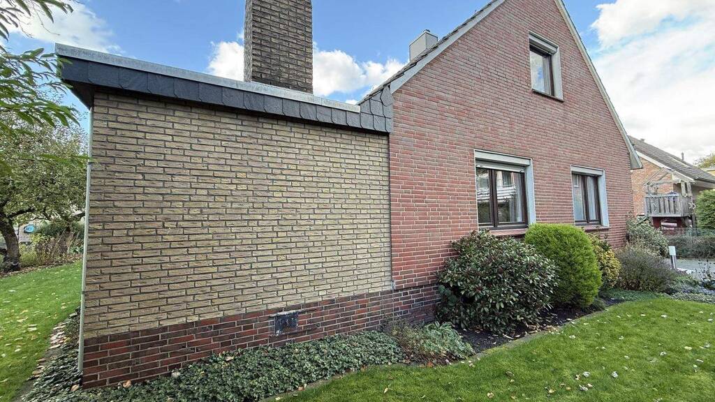 Ca. 1964 wurde dieses Einfamilienhaus in Massivbauweise (teils verklinkert, teils verputzt) errichtet. Es erhielt in späteren Jahren noch eine Terrassenerweiterung und vermutlich in den 1980er bzw. 2000er Jahren neue Fensterverglasungen. Im Wohn- und im Schlafzimmer wurden elektrische Rollläden nachgerüstet. Die ehemals verputzte Giebelwand wurde mit Riemchen in Klinkeroptik an das übrige Mauerwerk angepasst. 2019 wurde eine neue Gasheizung eingebaut.