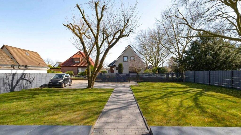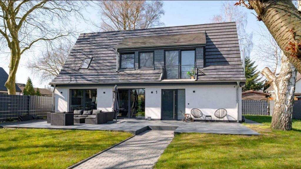 Dieses charmante Wohnhaus befindet sich auf einem attraktiven Eckgrundstück und überzeugt durch seinen hervorragenden Gesamtzustand. Im Jahr 2019 wurde die Immobilie umfassend saniert, sodass die heutigen Neubauanforderungen in jeder Hinsicht gerecht wird. Die durchdachte Architektur sorgt für eine angenehme und funktionale Raumaufteilung. Der Zugang erfolgt über den Eingangsbereich mit Flur, von dem aus sowohl ein Hauswirtschaftsraum, ein Gäste-WC als auch ein flexibel nutzbares Zimmer - ideal als Büro oder Gästezimmer - erreichbar sind. Von hier aus öffnet sich der großzügig gestaltete Wohnbereich, der dank der breiten Fensterflächen zur Terrasse mit viel Tageslicht versorgt wird. Der Essplatz und die moderne, offen konzipierte Küche sind harmonisch in den Wohnraum integriert und bilden mit hochwertigen Materialien und zeitgemäßer Ausstattung eine stimmige Einheit. Eine Wendeltreppe führt in das ausgebaute Dachgeschoss. Dort befinden sich ein Kinderzimmer mit Zugang zum Spitzboden sowie ein Schlafzimmer mit separater Ankleide und Balkon. Besonders hervorzuheben ist das stilvolle Badezimmer mit großen Fensterflächen und einer freistehenden Badewanne. Sowohl das Erdgeschoss als auch das Bad sind mit einer komfortablen Fußbodenheizung ausgestattet. Hochwertige Oberflächen, dezente Einbauleuchten, sichtbare Holzbalken und die erstklassige Dacheindeckung unterstreichen die hohe Verarbeitungsqualität des Hauses. Das 576 m² große Grundstück bietet eine ca. 57 m² große Terrasse, die zum Entspannen einlädt und gleichzeitig einen guten Überblick über den Garten ermöglicht. Ein moderner Zaun sowie der gepflegte Rasen sorgen für eine angenehme Privatsphäre. Ergänzt wird das Angebot durch zwei PKW-Stellplätze direkt auf dem Grundstück.