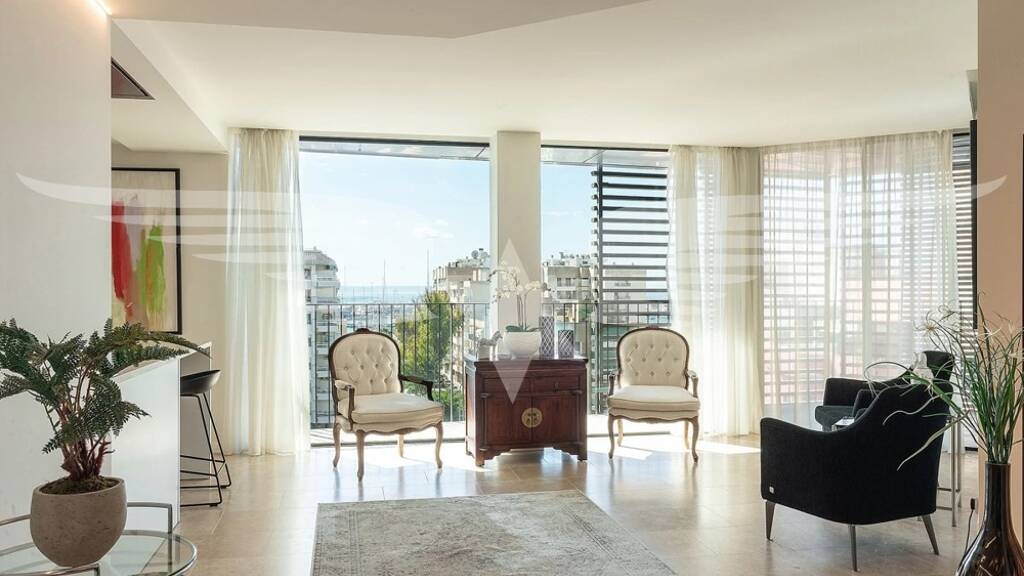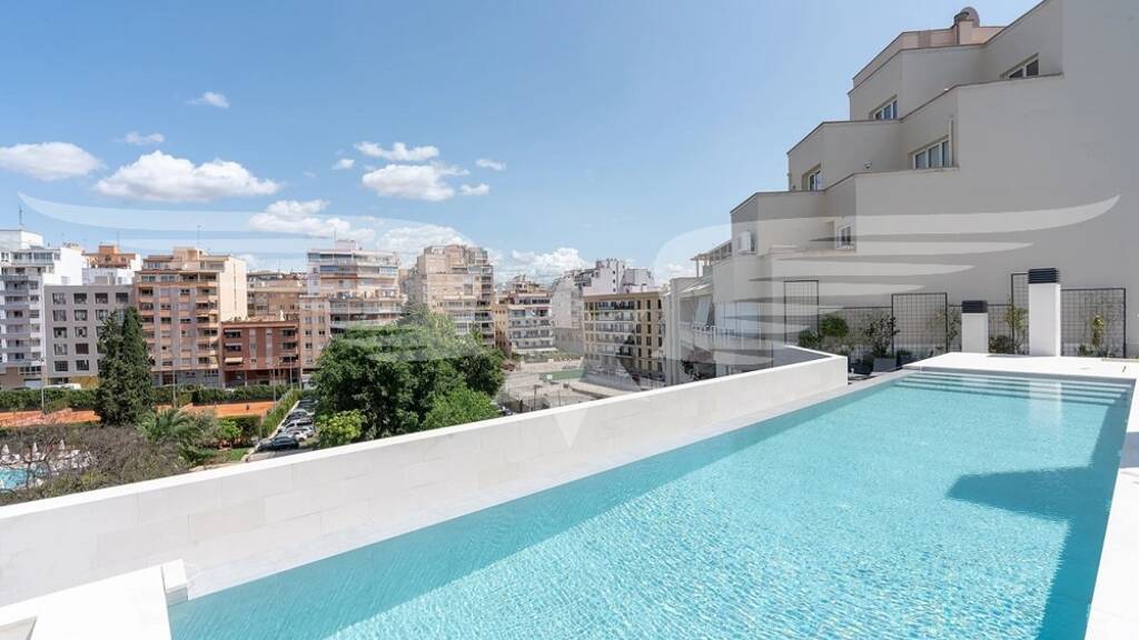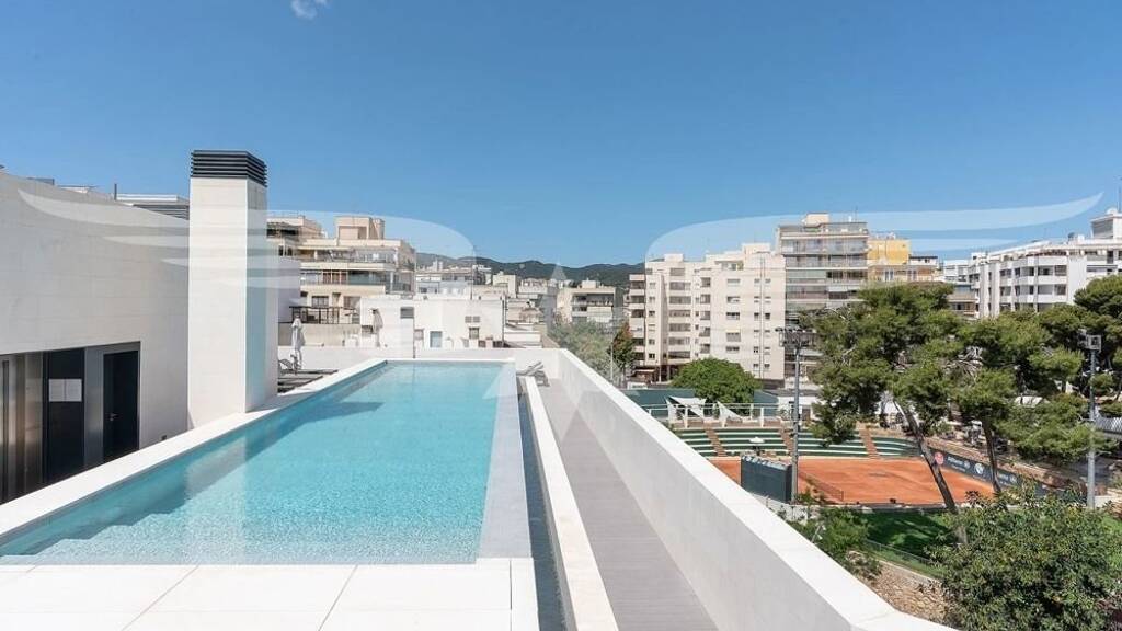 Die eingebauten Klimaanlagen verfügen üb er eine warm-/kalt Funktion, die Fußbodenheizung vermittelt zudem eine angenehme Wärme für die kühleren Tage. Eines der Highlights dieses Wohngebäudes ist die große Außen-Poollandschaft mit Sonnendeck auf dem Dach. Von hier aus genießt man fernab vom Treiben der Stadt den Blick auf den exklusiven und beliebten Tennisclub und teilweise auch den Hafen von Palma de Mallorca.