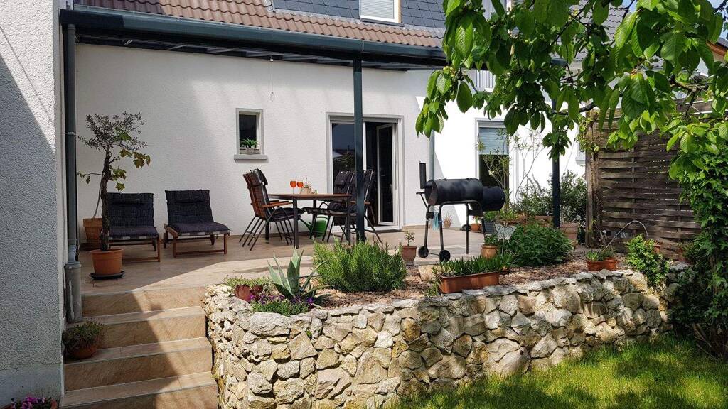 Der liebevoll mediterran gestaltete und eingewachsene Garten mit Gerätehaus und Obstbäumen lädt zum Verweilen ein und bietet einen ruhigen Rückzugsort zum Grillen, Entspannen und Genießen.