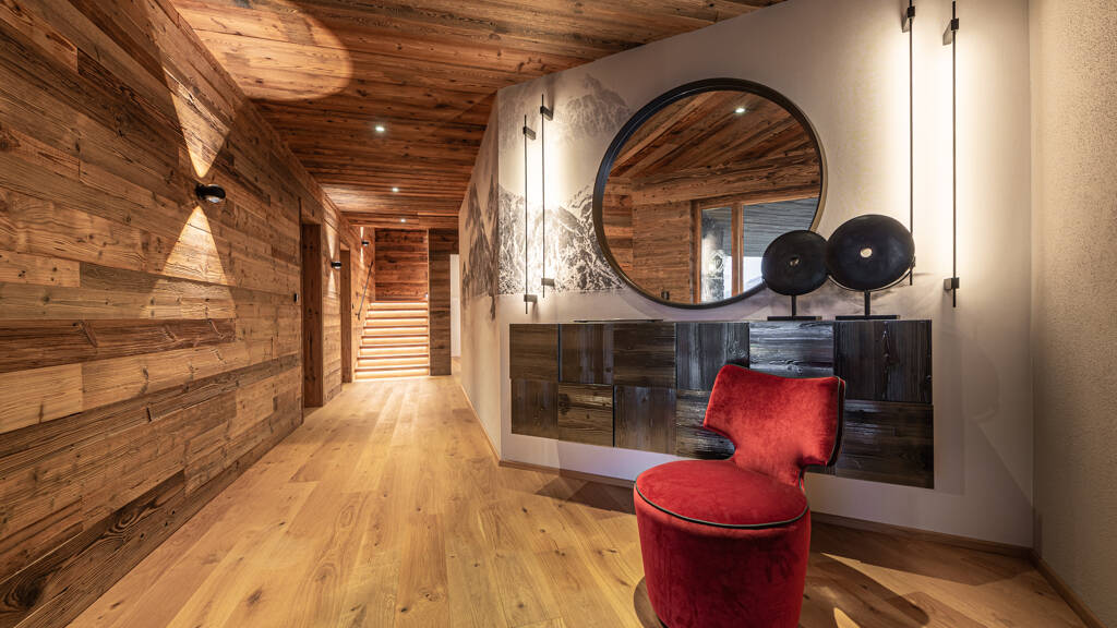 Dieses Luxuschalet im modernen, alpinen Stil bettet sich in eine der schönsten Lagen des Kirchberger Sonnbergs ein und verfügt zudem über eine seltene touristische Widmung. Höchste technische Ausstattung, in Kombination mit der hervorragenden Bauqualität und den ausgesprochen edlen Materialien, müssen erwähnt werden. Altholz, Naturstein und viel Glas dominieren die attraktive Fassade und spiegeln den modernen Kitzbüheler Architekturstil perfekt wider. Aufgrund der gelungenen Ausrichtung nach Süden, genießen die neuen Eigentümer den ganzen Tag Sonnenschein sowie einen atemberaubenden Blick in die Tiroler Bergwelt. Auf Grund der attraktiven Hanglage betreten Sie diese Luxusimmobilie im Untergeschoß. Eine großzügig bemessene Diele mit Garderobe sorgt für den sehr stimmigen ersten Eindruck. Auf dieser Ebene befinden sich Schlafzimmer samt en suite Badezimmer und eigenem Garten, ein Multifunktionsraum (nutzbar als Kino, Fitnessraum oder weiteres Schlafzimmer), ein Technikraum, ein Wirtschaftsraum sowie ein Lagerraum. Über den Personenlift oder die repräsentative Treppe gelangen Sie in das Erdgeschoß, der eigentlichen Schlaf- und Wellnessebene. Hier sind zwei Schlafzimmer mit Bädern en suite und der hochwertig ausgestattet und komplett eingerichtete Masterbereich untergebracht. Von allen Schlafzimmern gelangen Sie direkt auf geräumige Terrassen, die zum Verweilen einladen. Als zusätzliches Highlight auf dieser Ebene gilt sicherlich der lichtdurchflutete Wellnessbereich. Neben der Sauna, Relaxzone und der Wellnessdusche begeistert vor allem der Outdoorpool.