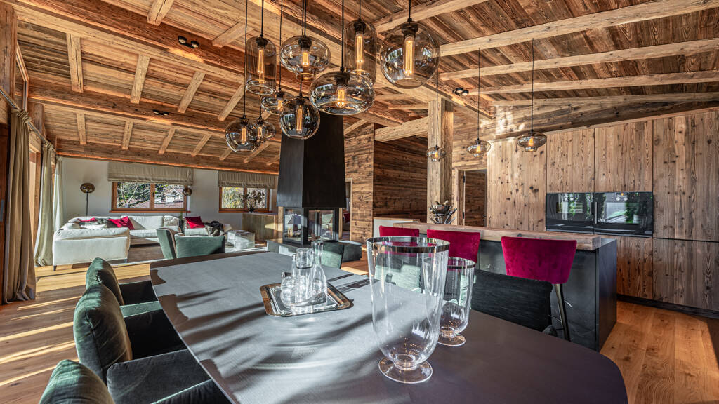 Das nächste Highlight, der über 85 Quadratmeter große Wohn-Essbereich, erwartet Sie im Obergeschoß. Über die durchgehend südlich ausgerichtete, bodentiefe Glasfront gelangt ausgesprochen viel Sonnenlicht ins Innere dieser Ebene. Hohen Wohlfühlcharakter mit Gemütlichkeit vermitteln der von Meisterhand gefertigte Altholzsichtdachstuhl und der stylisch designte offene Kamin. Die perfekt in das Wohnkonzept integrierte Küche begeistert Profi- und Hobbykoch gleichermaßen. Ein schönes Büro, ein kleiner Abstellraum, eine Gästetoilette und eine Garderobe komplettieren die oberste Etage. Das Luxuschalet wird mit Ausnahme des Multifunktionsraums im Untergeschoß von einem namhaften Innenarchitekten komplett eingerichtet. Bei der Ausstattung wird größter Wert auf qualitative Hochwertigkeit gelegt und ausschließlich Materialien, wie Altholz, Naturstein, Vollholztüren in Altholz, edle Armaturen und Fliesen sowie ein BUS-System verwendet. Für Ihren Fuhrpark stehen Ihnen eine Doppelgarage und zwei Außenstellplätze zur Verfügung. Eine Traumlage, vereint mit hohem Qualitätsstandard hat hier etwas Besonderes hervorgebracht.