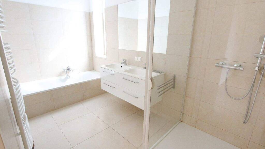 Das geräumige Badezimmer ist mit Badewanne, Walk-In-Dusche sowie einem Doppelwaschbecken ausgestattet. Ergänzt wird das Platzangebot durch einen praktischen Abstellraum sowie eine Garderobe, die zusätzlichen Stauraum bieten.