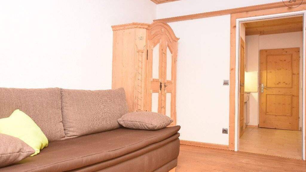 Im Wohn-Schlaf-Raum steht eine Essecke mit Stuhl, Sideboard mit Regal, Schreibtisch, TV und eine Couch mit Schlaffunktion (Größe 1,50 x 2,0 m) sowie Kleiderschrank zur Verfügung. Die voll ausgestattete Einbauküche ist in den Eingangsbereich integriert und bietet ein Garderobenregal sowie Zugang zum Bad. Das kleine Bad ist mit Waschtisch, Spiegel, WC und Dusche ausgestattet. Eine Gemeinschaftsterrasse (wird von vier Apartments genutzt) bietet einen malerischen Ausblick auf die Königsschlösser und die Allgäuer Landschaft.