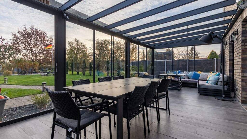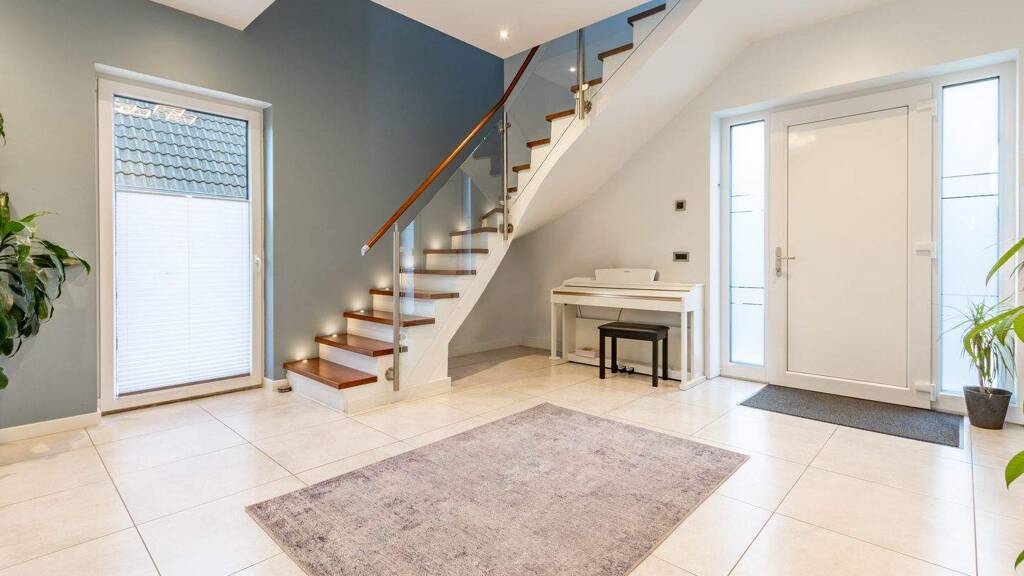 Dieses moderne Einfamilienhaus aus dem Jahr 2019 überzeugt durch eine gelungene Kombination aus zeitgemäßer Ausstattung, großzügigem Raumangebot und einem weitläufigen Grundstück. Mit ca. 186 m² Wohnfläche und einem Grundstück von ca. 1.227?m² bietet es ideale Voraussetzungen für Familien oder anspruchsvolle Paare, die Wert auf Komfort, Platz und Wohnqualität legen. Bereits beim Betreten des Hauses empfängt Sie ein großzügiger, heller Eingangsbereich, der sofort einen einladenden Eindruck hinterlässt. Der offene Wohn- und Essbereich bildet das Herzstück des Hauses. Eine moderne Kücheninsel integriert sich harmonisch in den Raum und schafft eine kommunikative Verbindung zwischen Kochen, Essen und Wohnen. Große Fensterflächen sorgen für viel Tageslicht und einen angenehmen Ausblick in den Garten. Direkt angrenzend befindet sich ein beheizter Sommergarten, der den Wohnraum elegant erweitert. Hier lässt sich das ganze Jahr über entspannen - sei es bei einem Frühstück mit Blick ins Grüne oder bei einem gemütlichen Abend mit Freunden. Im gesamten Haus sorgt eine komfortable Fußbodenheizung für angenehme Wärme und ein behagliches Wohnklima. Das Raumangebot umfasst insgesamt fünf Zimmer: Drei Schlafzimmer bieten ausreichend Platz für Familie oder Gäste, wobei das Hauptschlafzimmer zusätzlich mit einem begehbaren Kleiderschrank ausgestattet ist - ein echtes Komfort-Plus im Alltag. Ein separates Büro ermöglicht konzentriertes Arbeiten im Homeoffice oder kann flexibel genutzt werden, z.?B. als Gäste- oder Hobbyzimmer. Zwei moderne Bäder stehen zur Verfügung - optimal für das Familienleben oder den Besuch. Ein zusätzlicher Hauswirtschaftsraum sorgt für Ordnung und kurze Wege im Alltag. Der große Garten ist ein echtes Highlight: Mit viel Platz zum Spielen, Entspannen oder Gestalten bietet er zahlreiche Nutzungsmöglichkeiten - ob als Spielfläche für Kinder, Ruheoase oder Ort für gesellige Grillabende im Sommer. Dieses Einfamilienhaus befindet sich in einem sehr gepflegten Zustand und punktet mit moderner Technik, einer durchdachten Raumaufteilung und hochwertiger Ausstattung.