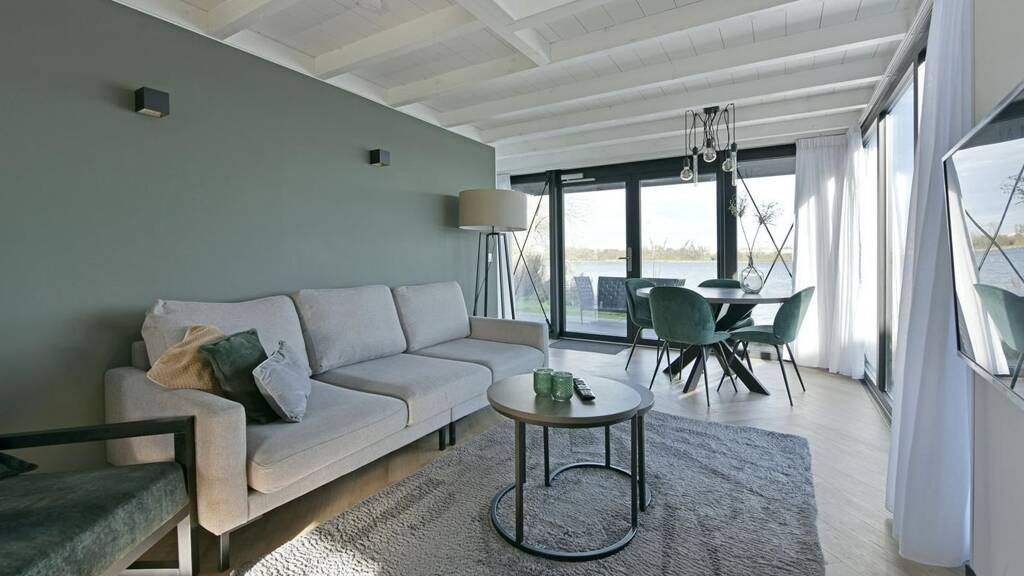 Betreten Sie das großzügige Wohnzimmer und lassen Sie sich vom beeindruckenden Raumgefühl verzaubern. Große Fensterfronten und ein stilvolles Oberlicht durchfluten den Raum den ganzen Tag mit natürlichem Licht - ein echtes Highlight für alle, die Helligkeit und Weite lieben. Der Blick aufs Wasser direkt vor der Tür macht das Wohngefühl perfekt.
