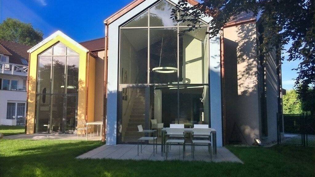In der idyllischen Gemeinde Immenstaad am Bodensee befindet sich dieses exklusive Doppelhaus, das höchste Ansprüche an Wohnkomfort und Architektur erfüllt. Die Immobilie bietet mit ihrem neuwertigen Zustand ein perfektes Zuhause für Menschen, die Wert auf Moderne und Qualität legen. Das Haus besteht aus zwei Hälften und ist bislang an Feriengäste vermietet worden. Ideal also für Kapitalanleger aber auch für Selbstnutzer, da die Haushälften mit wenig Aufwand verbunden werden können und das Baufenster zusätzliche Anbaureserven zulässt. Jede Haushälfte ist modern ausgestattet. Im Erdgeschoss befindet sich der großzügige Wohn- und Essbereich mit Zugang auf die nach Westen ausgerichtete Terrasse. Durch die vom Boden bis zum Dach verglaste Front ist der Blick nach draußen nicht eingeschränkt und bietet innen eine Stimmung zum sich wohlfühlen. Die offene Küche ist geschmackvoll eingerichtet und lässt keine Wünsche offen. Ebenso im Erdgeschoss, ist ein zweites Badezimmer mit Tageslicht mit einer eben begehbaren Dusche. Über eine schicke Treppe gelangen Sie auf die Galerie, von wo aus Sie in das Schlafzimmer gelangen. Auch das Hauptbadezimmer verfügt über Tageslicht und ist mit einer Badewanne ausgestattet.