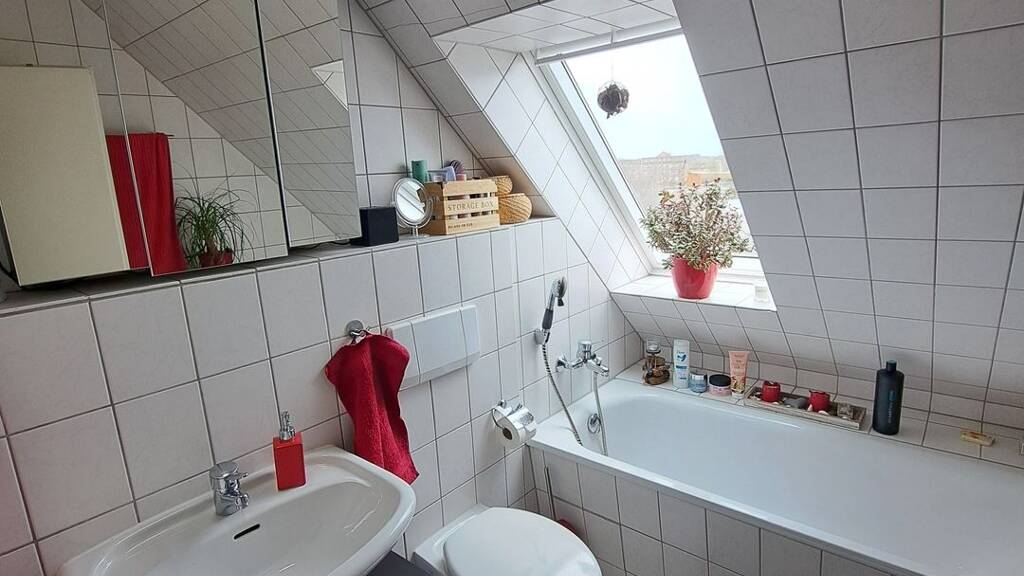 Die helle Wohnung umfasst eine Fläche von ca. 76,48m² über zwei Etagen und befindet sich im 1. und 2. Dachgeschoss eines 1995 erbauten Mehrparteienhauses.