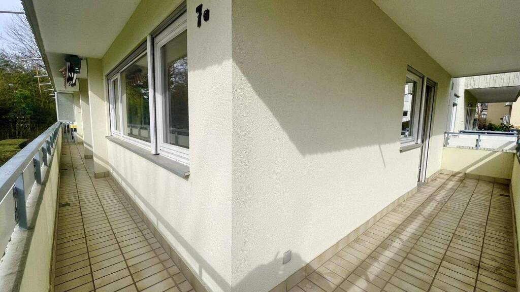 Vom Wohnzimmer aus gelangt man auf dem Balkon, der über das Hauseck bis zum Schlafzimmer führt und damit Wohnen, Essen und Schlafen verbindet. Durch die südliche Ausrichtung und die großen Fenster in allen drei Räumen, ist die Wohnung schön hell und einladend.