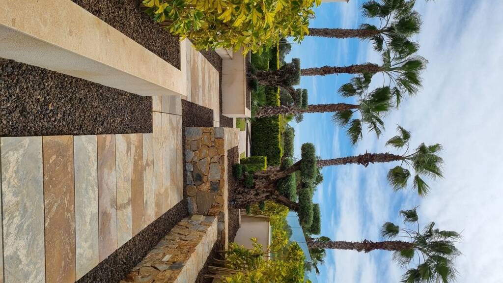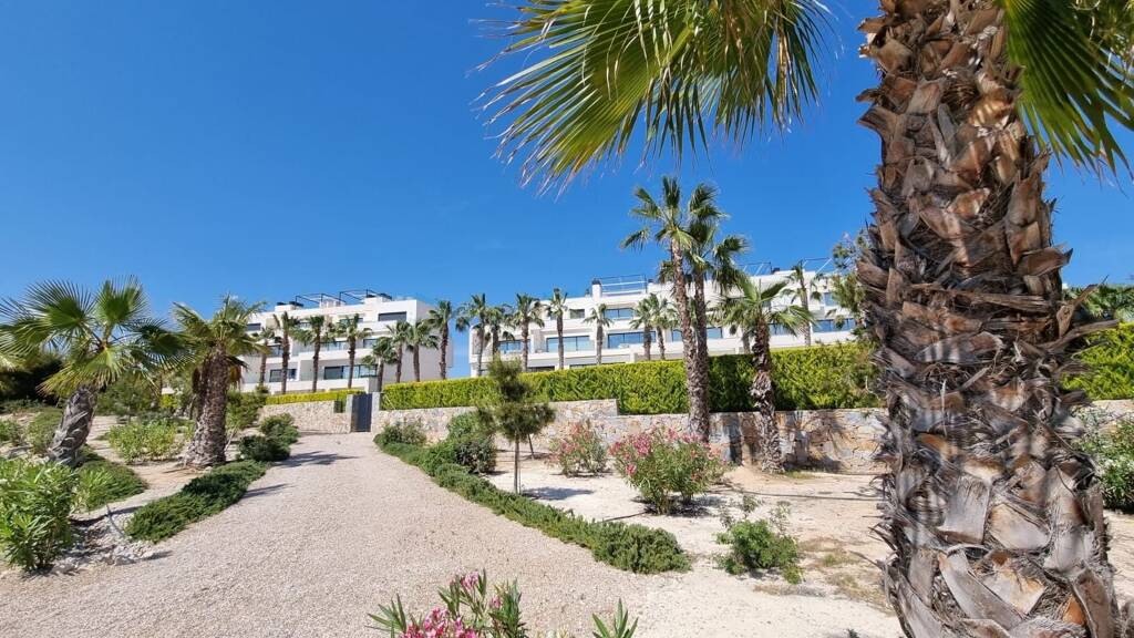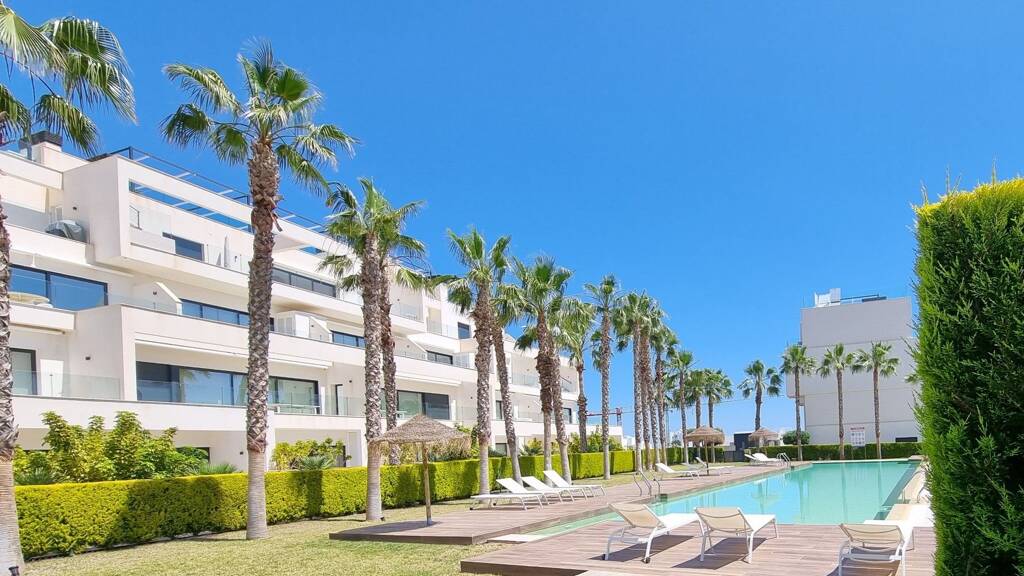 Wunderschönes und sehr luxuriös ausgestattetes Apartment mit drei Schlafzimmern und zwei Bädern im ersten Stock, privatem Parkplatz und Abstellraum in der Tiefgarage und einer geräumigen Südterrasse von 30 Quadratmetern, nur 50 Minuten südlich des Flughafens von Alicante.Wenn man das Gebäude Hinojo II entweder von der Tiefgarage oder vom Tor aus, mit dem Aufzug oder über die Treppe betritt, gelangt man in den ersten Stock, der nur zu dieser Wohneinheit führt, was zusätzliche Privatsphäre und Ruhe schafft. Wenn man die Wohnung betritt, findet man sich sofort in der hellen, geräumigen, offenen Küche und dem Wohnzimmer wieder, die nach Süden ausgerichtet sind. Der Wohnbereich bietet viel Stauraum und die Küche ist voll ausgestattet mit luxuriösen Markengeräten wie einer Bosch-Mikrowelle, einem Backofen, einem Induktionskochfeld, einer Waschmaschinen-Trockner-Kombination, einem Geschirrspüler, einem Siemens-Kühlschrank, einer an der Decke montierten Dunstabzugshaube und einem Trinkwasserspender. Vom offenen Grundriss aus gelangt man über Schiebetüren, die sich von beiden Seiten öffnen lassen, auf die Terrasse. Die hellen holzfarbenen Fliesen, die in der gesamten Wohnung zu finden sind, setzen sich auch auf der Terrasse fort. Die Terrasse verfügt über Strom- und Fernsehanschlüsse, einen Außenwasserhahn und die Möglichkeit, elektrische Markisen anzubringen und zu installieren. Vom Wohnzimmer aus gelangt man in das geräumige Hauptschlafzimmer, das einen einzigartigen Blick auf die Palmen bietet. Das Hauptschlafzimmer verfügt über ein eigenes geräumiges Bad mit Regendusche, viel Stauraum, einen Schreibtisch und einen direkten Zugang zur Terrasse über Schiebetüren. Vom Wohnzimmer aus sind das zweite und dritte Schlafzimmer sowie das zweite Badezimmer durch eine atemberaubende, maßgefertigte Schwenktür zu erreichen. Die Schlafzimmer haben die gleiche Größe und das gleiche Design, blicken auf eine wunderschöne grüne Landschaft und verfügen über große Einbauschränke. Das zweite Badezimmer ist einzigartig gefliest und verfügt über eine Dusche mit Regendusche. Die Wohnung befindet sich in Block I der bewachten Hinojo Phase II Community von Las Colinas. Die Hinojo-Gemeinschaft befindet sich auf einem der höchstgelegenen Grundstücke in Las Colinas, mit Blick auf den mediterranen Wald und die atemberaubendsten Sonnenuntergänge. Zur Wohnung gehören ein privater Parkplatz und ein Abstellraum, der direkt mit dem Aufzug von der Wohnung aus erreichbar ist. Zu den Gemeinschaftsbereichen der Wohnanlage Hinojo II gehören Gärten, ein privater Pool und Entspannungsbereiche sowie ein Bouleplatz, umgeben von Palmen und einheimischer Vegetation.