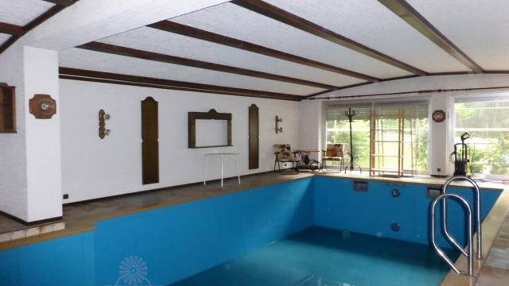 Gästezimmer mit Waschbecken, Schwimmhalle mit Whirlpool, Dusche, separatem WC und ebenerdigem Ausgang zum Garten, Waschküche, Heizungsraum, Öllagerraum, Vorratskeller, Abstellkeller, Kellerdiele