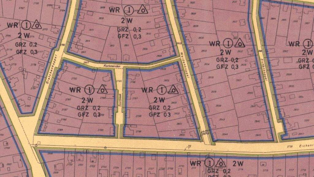 Aktuell ist das Grundstück noch mit einem kleinen Altbau mit Schuppen bebaut. Der Abriss der Altsubstanz erfolgt auf Kosten des Erwerbers. Die Bebaubarkeit richtet sich nach dem rechtsgültigen Bebauungsplan. Die bauliche Ausweisung für das Grundstück lautet WR-I-o, 2 W. Dies bedeutet, dass es sich um reines Wohngebiet handelt und maximal zwei Wohneinheiten ( Einzel - oder Doppelhaus) errichtet werden dürfen. Ferner darf in offener Bauweise ein Vollgeschoss zzgl. ausgebautem Dachgeschoss errichtet werden. Jegliche Art der Bebauung ist mit dem Bauamt abzustimmen.
