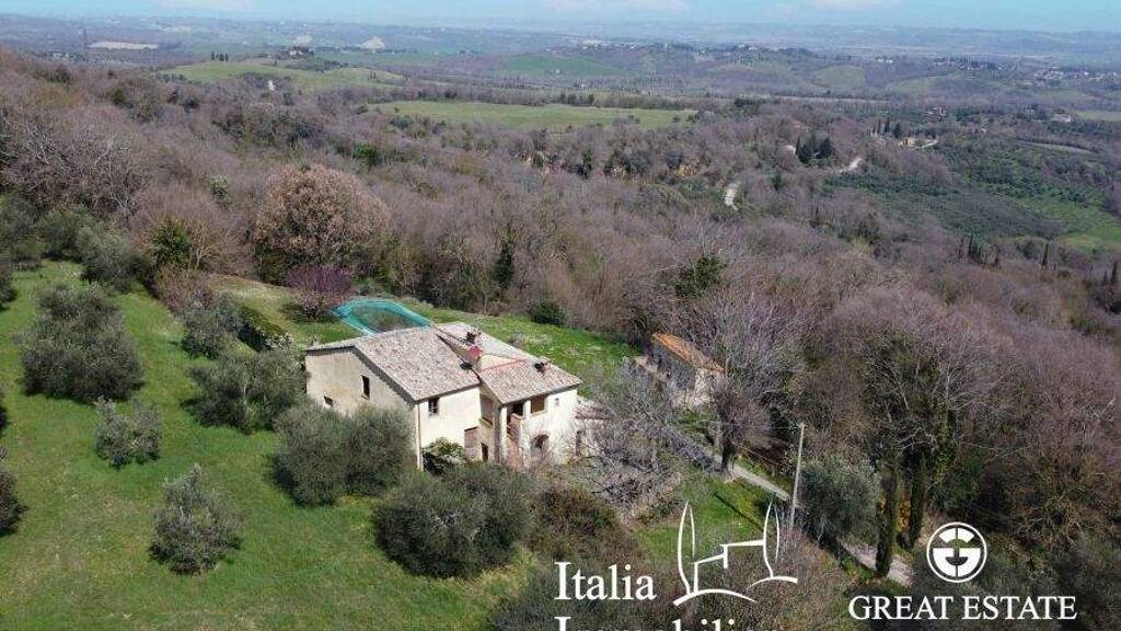In Sarteano, in einer ruhigen und exklusiven Gegend, steht "La dimora dei Fichi Giganti", ein traditionelles Bauernhaus aus dem 19. Jahrhundert. Der Zugang zum Anwesen erfolgt über eine 600 m lange weiße Straße. Vom Haupttor aus führt eine 100 m lange Privatstraße zum Bauernhaus, von dem aus man einen schönen Blick auf die Seen hat. Das Bauernhaus umfasst eine Fläche von 310 Quadratmetern, die sich auf zwei Ebenen verteilen. Im Erdgeschoss befindet sich das Gebäude in unfertigem Zustand, wo sich ein Geräteraum, eine Waschküche und verschiedene Lagerräume befinden, die an die Stelle des ehemaligen Stalls, der Lagerräume und des Holzschuppens getreten sind. Der Zugang zum ersten Stock erfolgt über eine Außentreppe, die zu einer schönen Loggia führt, von der aus man in ein Esszimmer mit einem großen und charakteristischen traditionellen Kamin gelangt. Auf der gleichen Etage befinden sich auch ein Wohnzimmer und ein Badezimmer mit Dusche. Vom Wohnbereich aus gelangt man über 3 Stufen in ein Zwischengeschoss, das den Schlafbereich mit 3 Schlafzimmern und einem Bad mit Wanne beherbergt. In dem herrlichen Garten von 1480 qm befindet sich ein 10x5m großer Swimmingpool mit einer eleganten römischen Treppe und Blick auf das Tal. Das Anwesen wird durch ein kleines Nebengebäude von 19 m² vervollständigt, das aus einem Raum besteht, der als technischer Raum genutzt wird, einem Badezimmer mit Dusche, das dem Pool dient, und zwei Räumen, die als Lager genutzt werden. Das Anwesen umfasst 7,9 ha Land, teilweise bestehend aus Olivenhainen und Kastanienbäumen.
