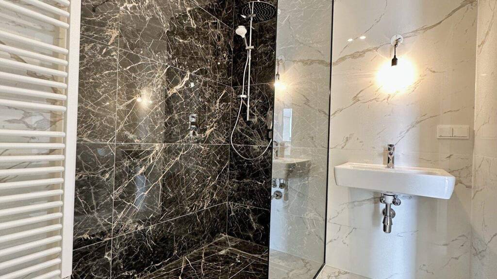 Eine bodenebenerdige Dusche im Keramik- Stil sowie Sanitäranlagen von der Marke Laufen Pro runden die hochwertige Ausstattung ab.