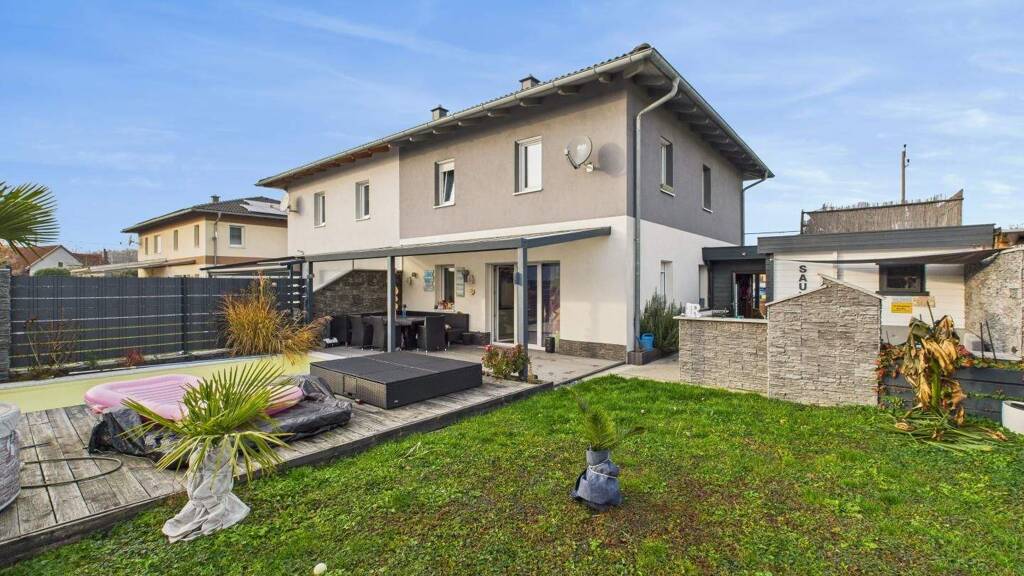 Dieses gepflegte Familienhaus vereint modernes Wohngefühl, hochwertige Ausstattung und einen Gartenbereich, der sich wie ein privates Urlaubsresort anfühlt. Die Doppelhaushälfte wurde 2012 in Massivbauweise errichtet, laufend gepflegt und mit besten Materialien ausgestattet - ein Zuhause, das ohne Renovierungsaufwand sofort bezogen werden kann.
