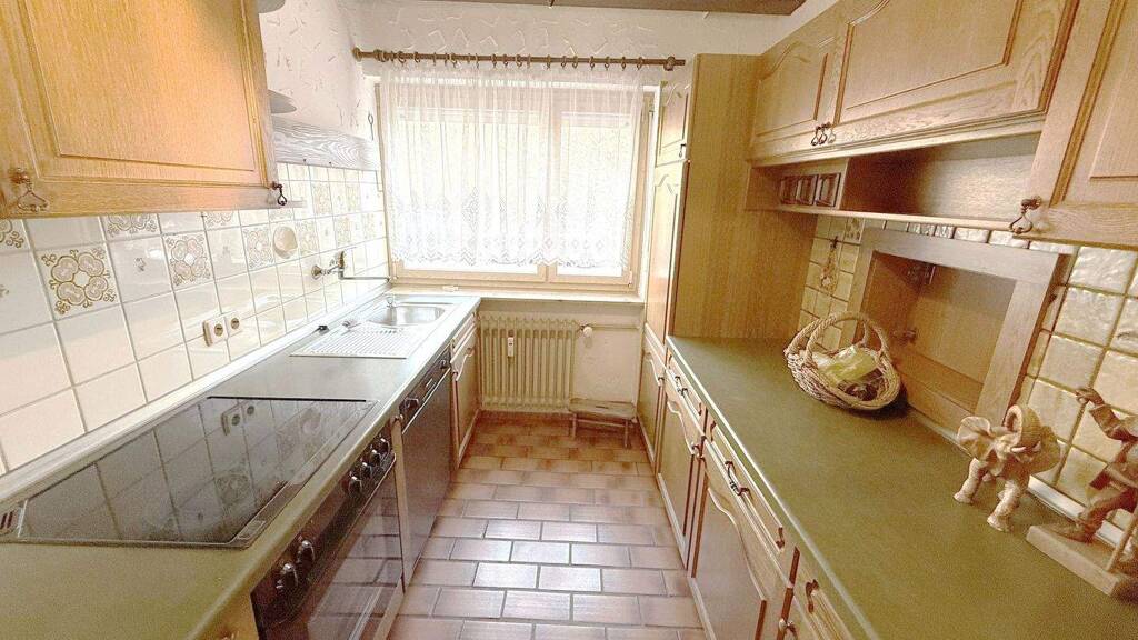 Gleich links befindet sich das geräumige Tageslicht-Bad. Es verfügt über eine Wanne, ein Waschbecken und Platz für die Waschmaschine. Das WC befindet sich separat, direkt daneben. Im Anschluss daran befindet sich die Küche. Sie hat ein großes Fenster und ist mit einer rustikalen Einbauküche mit Geräten ausgestattet. Außerdem verfügt sie über eine praktische Durchreiche in das Esszimmer.
