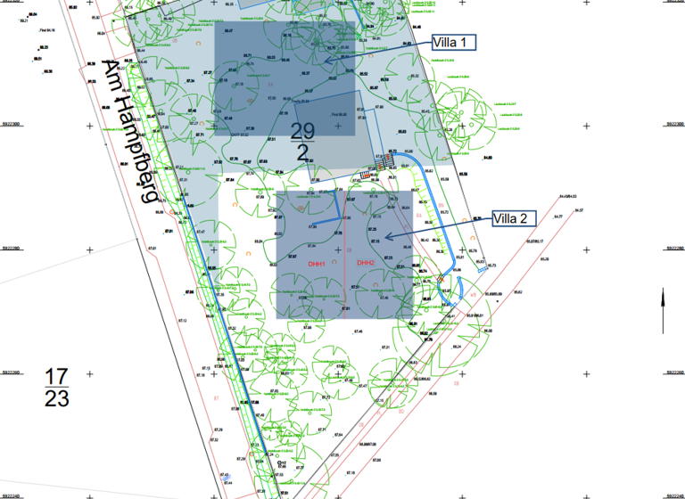 Eine erste Grundlagenermittlung nach HOAI hat nachfolgendes ergeben: - Doppelhaus und Einfamilienhaus mit Einliegerwohnung - Grundstücksgröße = ca. 1.500 m² - GFZ = 0,15 x 1.500 m² = 225,00 m²
