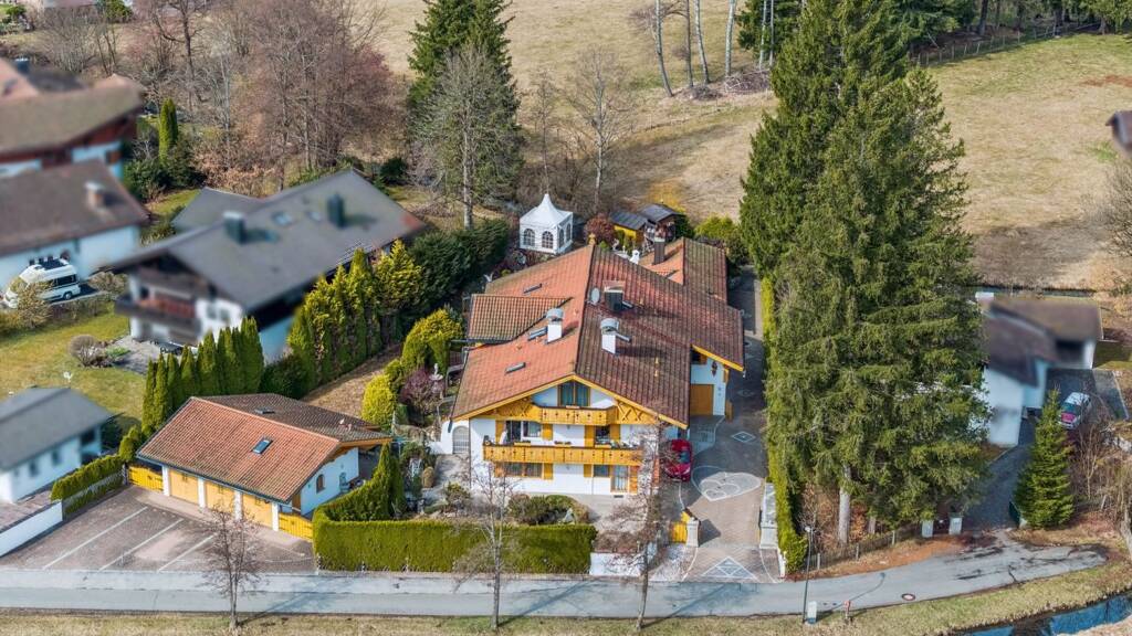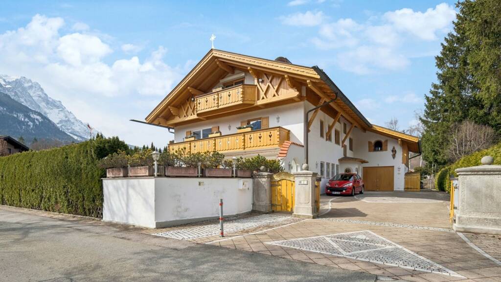 In absolut ruhiger und sonniger Lage von Grainau - fast schon etwas versteckt - befindet sich dieses ansprechende Anwesen am Ende einer Sackstraße. Das Haupthaus, das Gästehaus und das Garagengebäude ergeben durch die einheitliche und liebevolle Gestaltung ein harmonisches Ganzes. Vom gepflasterten Vorplatz gelangt man in das Hauptgebäude, das aktuell in vier Wohnungen aufgeteilt ist. Die Wohnung im Erdgeschoss bietet eine Stube mit gemütlicher Eckbank und einem gemauerten Kaminofen. Von hier gelangt man auch auf die Südterrasse mit freiem Blick auf das Zugspitz-Massiv. Die voll ausgestattete Küche schließt sich an. Das Kamin-Zimmer, zwei Schlafzimmer, ein Bad mit Dusche und Badewanne sowie ein separates Gäste-WC vervollständigen das Raumangebot auf dieser Etage. Im 1. Obergeschoss befinden sich zwei 3-Zimmer-Wohnungen - beide mit Balkonen nach Süden und Osten bzw. Süden und Westen. Diese beiden Wohnungen sind derzeit vermietet. Die Mieteinnahmen betragen 21.240 EUR p. a. zzgl. NK (Stand 4/2026). Die Wohnung im Dachgeschoss erstreckt sich über die gesamte Etage. Das zentrale Wohnzimmer hat einen Quergiebel zum Südbalkon hin. Die beiden Schlafzimmer verfügen jeweils über einen Balkon nach Osten bzw. Westen und einen großen, begehbaren Kleiderschrank. Eine voll ausgestattete Küche und zwei Bäder komplettieren diese gleichermaßen gemütliche wie hochwertig ausgestattete Wohnung.