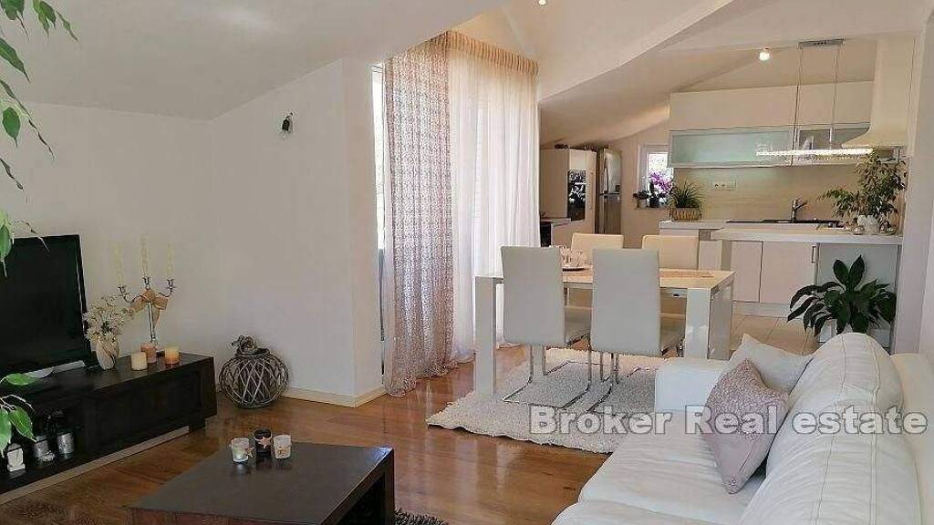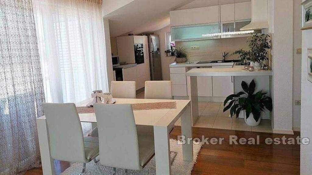 Auf dem Dachboden befindet sich eine Wohnung mit einer Gesamtwohnfläche von 132 m2, die aus einem Wohnzimmer, einer Küche mit Essbereich, zwei Schlafzimmern, zwei Badezimmern und einem Ankleidezimmer besteht. Ein Badezimmer ist nicht möbliert. Die Wohnung verfügt über eine Terrasse.