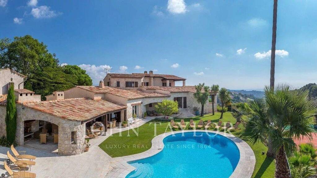 Située dans l'un des quartiers résidentiels les plus prisés de Saint-Paul-de-Vence, cette superbe propriété en pierre de 560 m², perchée en position dominante et au calme, s'étend sur un terrain de 6 400 m² et offre une vue imprenable sur la mer et les collines environnantes.