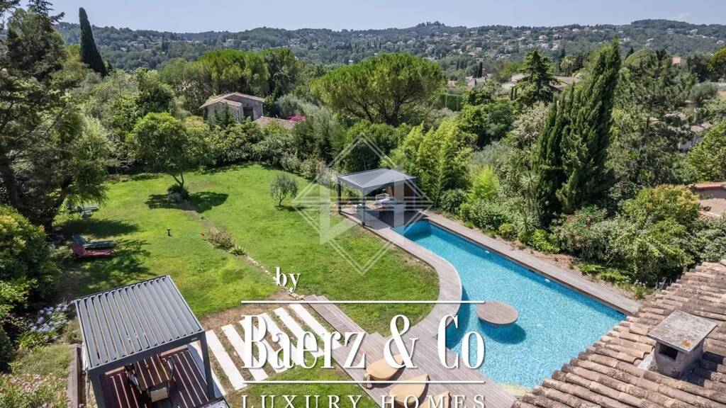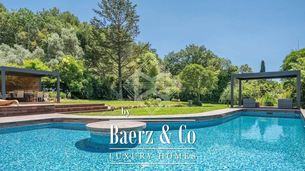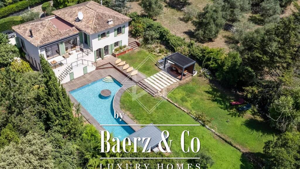 joint sole agent : just 400 m from the village of valbonne, this villa offers easy access to all local amenities, including shops, restaurants and international schools. valbonne is renowned for its provencal charm and year-round vibrancy, making it an ideal place to live for families and those seeking simplicity and authenticity. nestled in a serene setting, the villa enjoys absolute peace and quiet and optimal sunshine. the superb flat garden is a real paradise for children, who can play in complete safety, while adults can relax by the pool or under the pergola, in a soothing zen atmosphere. the spacious interior has been recently renovated and decorated in a modern style! the large living room, bathed in natural light thanks to its large openings and high ceilings, opens onto a very welcoming terrace that overlooks the beautiful grounds. the kitchen is very functional and offers enough space to host large gatherings! the home features 4 bedrooms, including a beautiful master suite. additional spaces on the garden level offer the possibility to create a small independent apartment, host clients, set up a home office, or create a gym or playroom.