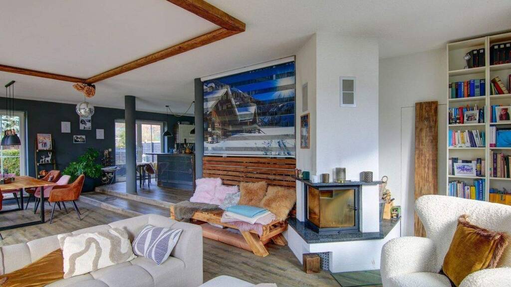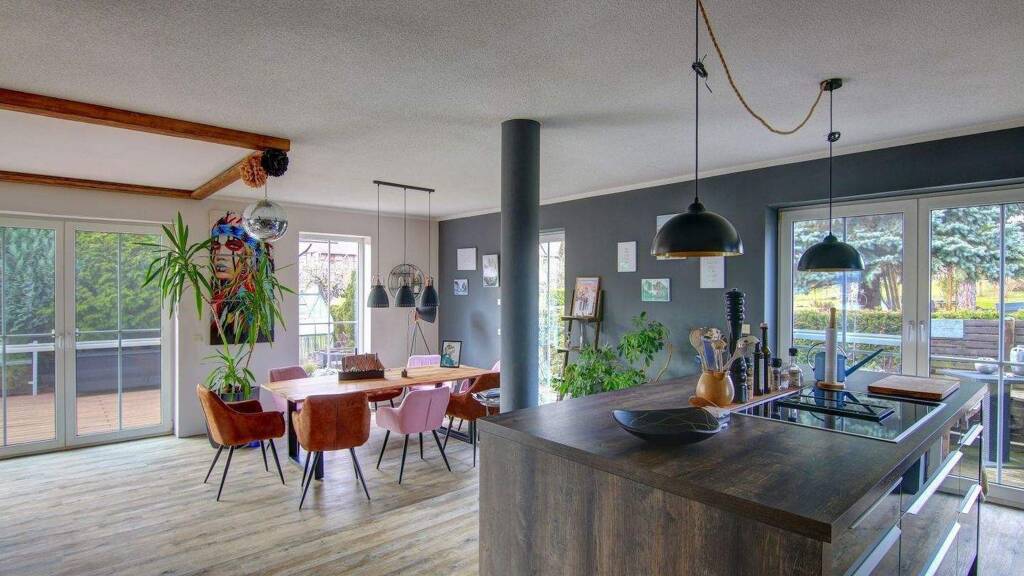 Sie erreichen den großzügigen Wohn- Essbereich mit einer tollen Einbauküche und einer Kochinsel. Markengeräte lassen diese Küche zum Kochparadies werden. Dieser Bereich ist offen und hell und man kann fast durch das gesamte Erdgeschoss durchblicken. Esstisch, Kamin und Zugang zu Terrasse lassen diesen Bereich vollkommen wirken.