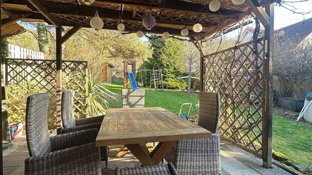 Ein besonderes Highlight ist der Anbau, in dem sich das Elternschlafzimmer mit begehbarer Ankleide, ein Waschraum sowie ein separates WC befinden. Von hier aus besteht ein direkter Zugang zur Terrasse und in den weitläufigen Garten – ideal für entspannte Stunden im Freien.
