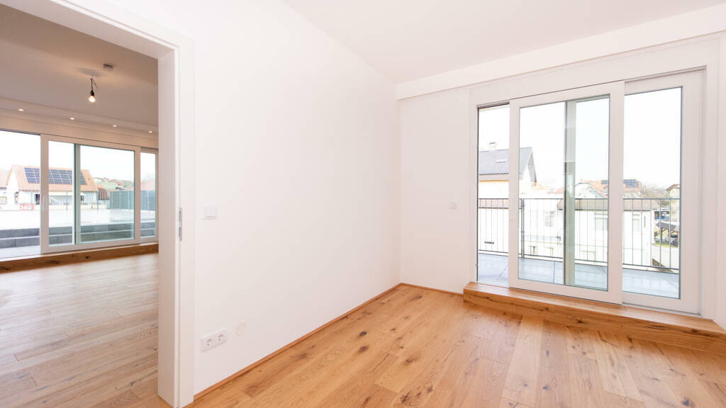 Das zeitlose Design des Penthouse besticht durch edles Eichenparkett und großformatige Feinsteinzeugfliesen, die nicht nur ästhetisch ansprechend sind, sondern auch äußerst pflegeleicht und strapazierfähig - ein wahrer Blickfang für Ihr neues Zuhause.