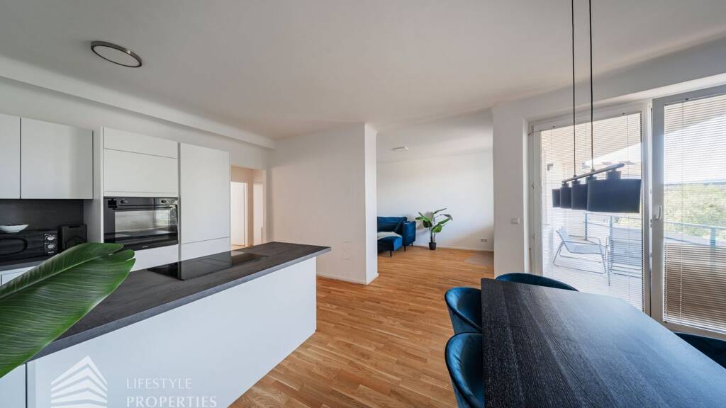Bei Betreten der Wohnung gelangen Sie in den zentral gelegenen Eingangsbereich, welcher alle Räumlichkeiten miteinander verbindet. Das Herzstück der Wohnung bildet die offene Wohnküche mit ca. 39 m², die nicht nur viel Platz bietet, sondern auch komplett ausgestattet ist und somit direkt genutzt werden kann. Über die Wohnküche gelangen Sie zum Highlight der Wohnung. Zur geräumigen Loggia mit ca. 12 m², die zum Entspannen und Verweilen einlädt. Gegenüber der Wohnküche gelangen Sie in die zwei weiteren Zimmer, welche sich mit ca. 10 m² und ca. 14 m² optimal als Schlaf- oder Arbeitszimmer anbieten. Über den Vorraum erreichen Sie die restlichen Räumlichkeiten. Das moderne Badezimmer ist mit einer Badewanne ausgestattet, und das separate WC bietet zusätzlichen Komfort. Ein praktischer Abstellraum sorgt zudem für ausreichend Stauraum.