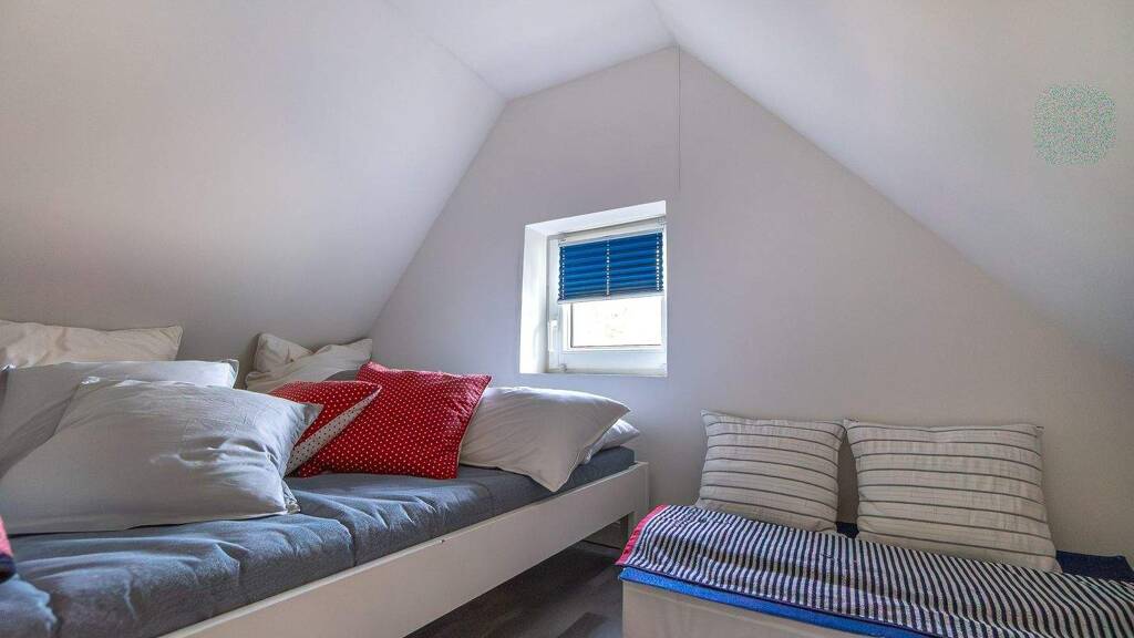 Das Dachgeschoss ist über eine Holztreppe erreichbar und bietet einen Mittelflur mit Platz für einen kleinen Arbeitsplatz oder eine Leseecke, ein gefliestes Duschbad mit WC und Waschbecken sowie ein großzügiges Schlafzimmer. Die Etage eignet sich sowohl als privater Rückzugsort als auch für eine flexible Nutzung, etwa als Kombination aus Schlaf- und Arbeitsbereich.