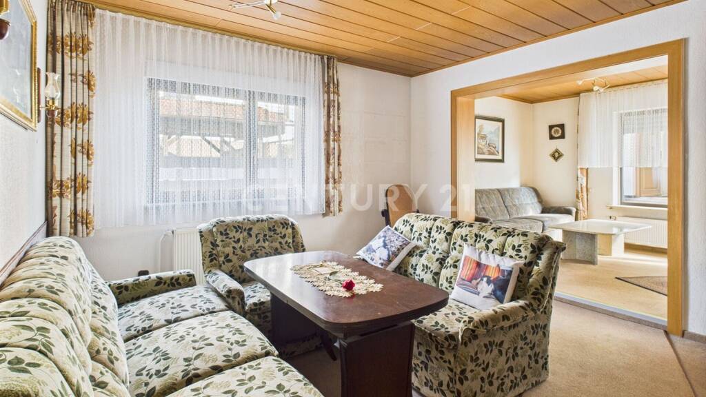 Das 1961 erbaute Haus befindet sich in einem gepflegten Gesamtzustand. Das Raumkonzept der beiden Wohnetagen umfasst jeweils drei Zimmer, ein Badezimmer und eine Küche. Der Wohnbereich im Erdgeschoss ist zur Terrasse hin mit einem weiteren Raum + Terrasse erweitert; im Dachgeschoss befindet sich an dieser Stelle ein großer Balkon.