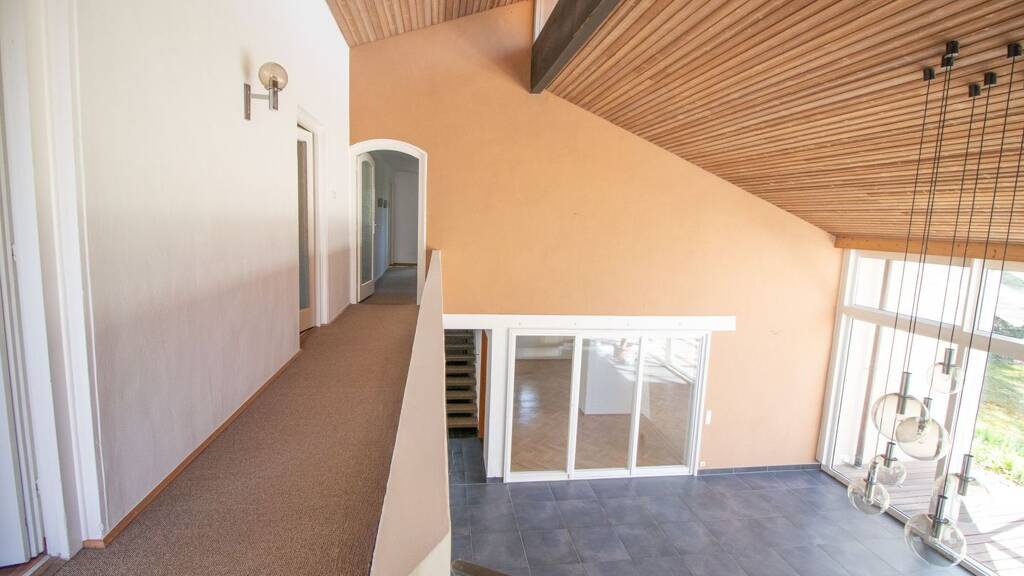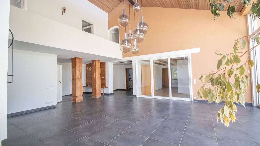 Im Inneren öffnet sich ein beeindruckendes, großes Wohnzimmer mit hohen Decken und einer offenen Galerie, die dem Raum eine besondere Weite und Leichtigkeit verleiht. Große Fensterfronten lassen viel Tageslicht herein und bieten einen schönen Blick ins Grüne. Der Kamin bildet das Herzstück des Wohnbereichs und sorgt an kühleren Tagen für eine warme, gemütliche Stimmung.