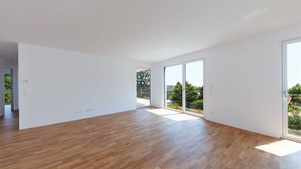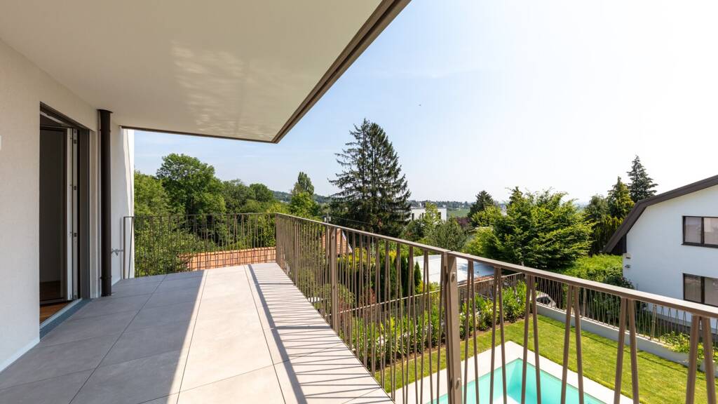 Auf rund 133m² Wohnfläche erstreckt sich diese genial aufgeteilte Terrassenwohnung, die Ihnen den Atem rauben wird. Bereits beim Eintreten in den 2024 fertiggestellten Neubau genießen Sie einen wundervollen Grün- sowie Stadtblick, der eindrucksvoller kaum sein kann. Sei es von der großzügigen Wohnküche, einem der drei hochmodern ausgestatteten Schlafzimmer sowie den zwei Balkonen mit gesamt ca. 22m² Fläche - das unverbaubare Panorama erschafft ein Gefühl der Freiheit.