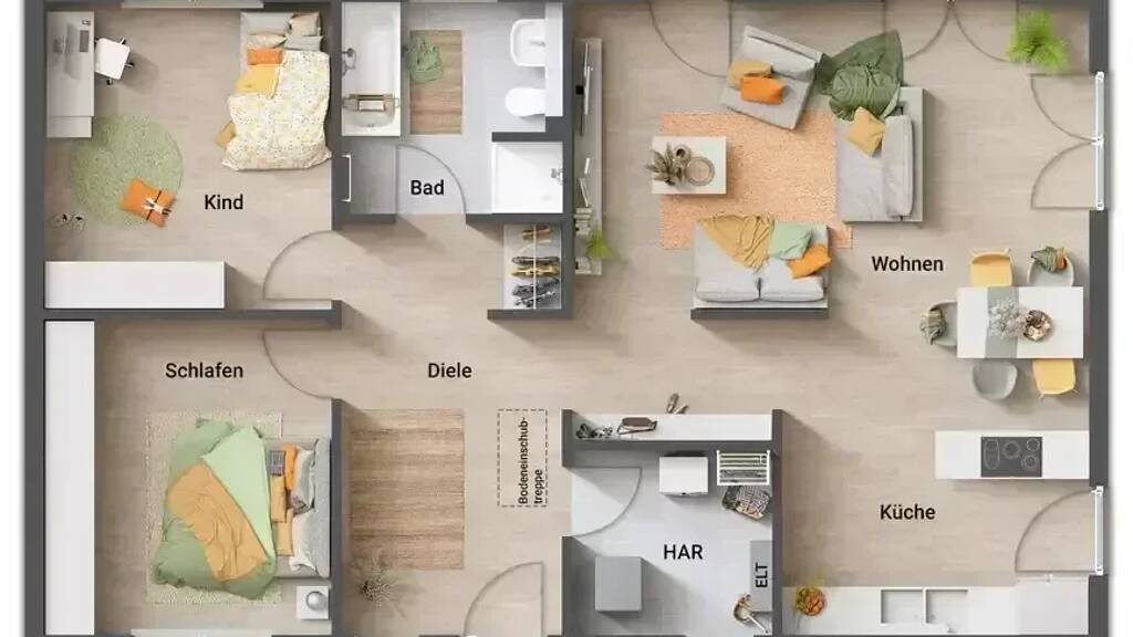 Die Baunebenkosten und das Grundstück sind in diesem Exposé NICHT enthalten. Raumaufteilung Der offen gestaltete Wohn-, Koch- und Essbereich ist das Zentrum des Familienlebens. Hier wird gemeinsam gekocht, gelacht und entspannt. Die bodentiefen Fenster lassen nicht nur viel Licht hinein, sondern ermöglichen auch vielfältige Zugänge zum Garten. Ob von der Küche oder vom Sofa aus, Ihre Wohlfühloase im Grünen ist stets nur ein paar Schritte entfernt. Besonders praktisch und platzsparend ist die integrierte Garderobe im Flur. Außerdem gibt es verschiedene Wohnbereiche, die auf Wunsch mit (Glas-)Türen abgetrennt werden können.