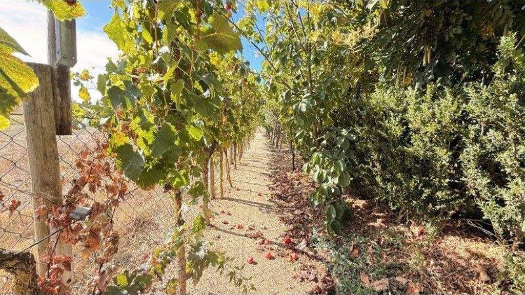 Das Anwesen ist durch eine Straße geteilt und umfasst verschiedene Bereiche mit Busch, Weinbergen, produktivem Gemüsegarten, Apfelbäumen, Olivenbäumen und anderen Obstbäumen sowie gepflanzten Blumen, die den Raum verschönern und eine einladende Atmosphäre schaffen.