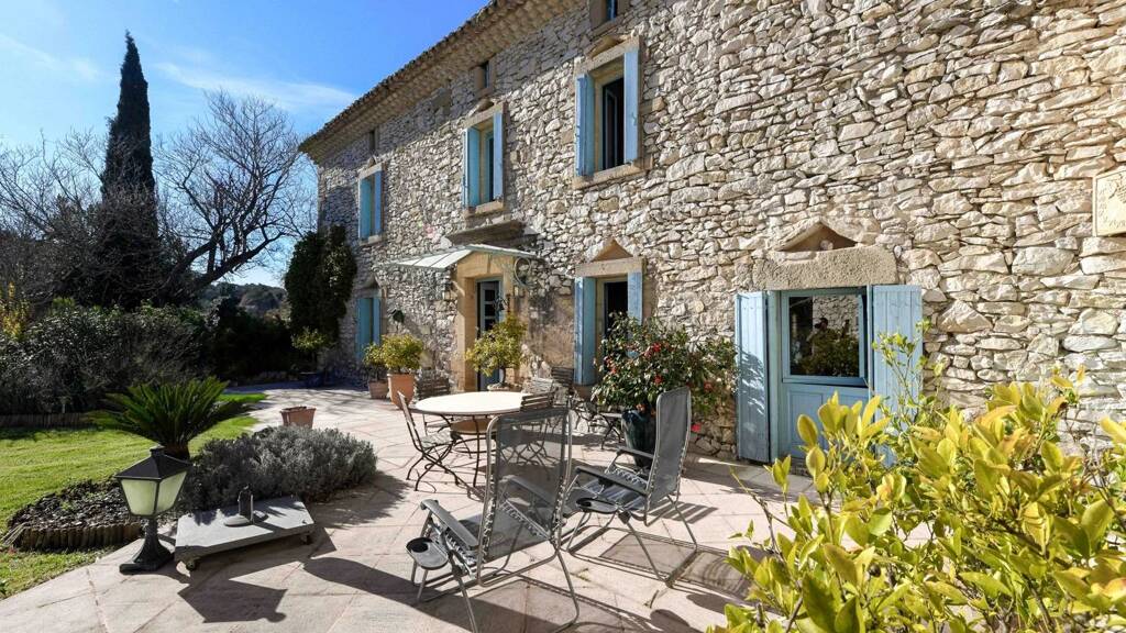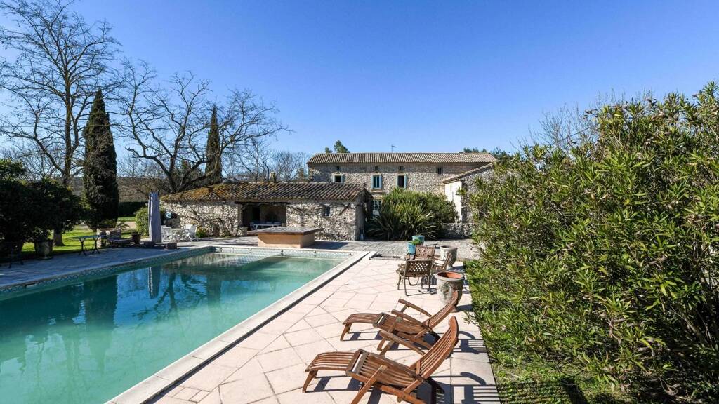 In the heart of the countryside, just 10 kilometers from the ducal town of Uzes, this restored 330 m2 country house, spread over three floors, offers an idyllic, peaceful living environment with no overlooking neighbors.