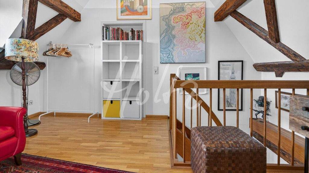 Hochwertige Holzdielen verleihen den Wohnräumen eine warme und natürliche Atmosphäre. Stilvolle architektonische Elemente wie sichtbare Holzbalken und charakteristische Details aus der Bauzeit betonen den historischen Charme und machen diese Maisonette zu einem besonderen Zuhause mit Persönlichkeit.