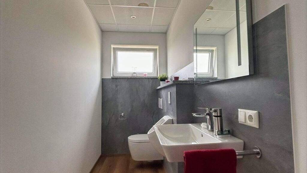 - Raumhöhe ca. 8 Meter - drei Sektionaltore - Lüftungsanlage mit Wärmerückgewinnung - zwei Krananlagen mit fünf Tonnen Traglast - Aufenthaltsraum mit moderner Einbauküche - Lager im Erd- und Obergeschoss - Büroräume mit Fußbodenheizung und 8 mm Vinylboden - Gedämmte Bodenplatte - Industrieboden Klickfliesen 10 mm - Ebenes Grundstück, Parkflächen - Kunststofffenster mit Isolierverglasung