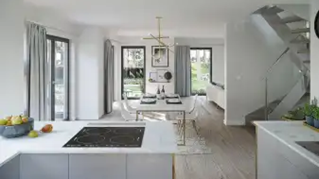Das großzügige Einfamilienhaus besticht durch die modernen, großflächigen Fenster, die viel Licht ins Innere lassen und zum Verweilen mit Familie und Freunden einladen. Wohnen, Essen und Kochen bilden im Erdgeschoss eine Einheit und bieten über die Terrasse direkten Zugang in den Garten, sodass Sie Ihre Kinder stets im Blick haben. Im Erdgeschoss befinden sich außerdem ein Technikraum sowie ein Gäste-WC. Im Dachgeschoss gibt es keinen Streit um die Auswahl der Zimmer, denn diese sind nahezu gleich groß und im großzügigen Wellness-Bad gibt es am Morgen auch kein Gedränge.