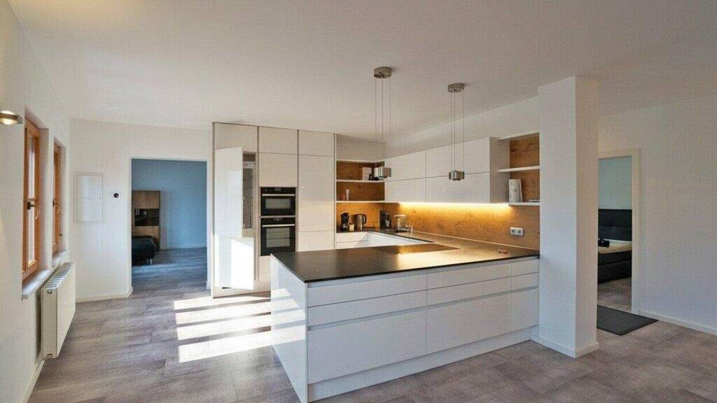 Geboten werden hier ein Schlafzimmer, ein Bad mit Wanne, Walk-In-Dusche und Waschmaschine sowie ein separates WC. Herzstück ist die großzügige, moderne DAN-Wohnküche mit Kücheninsel und hochwertigen Einbaugeräten sowie der helle, freundliche Essbereich. Vom angeschlossenen Wohnzimmer mit schönem Ausblick in die Stadt Mörbisch mit Kirchturm gibt es einen Ausgang auf die Südwest-Terrasse mit elektrischer Markise.