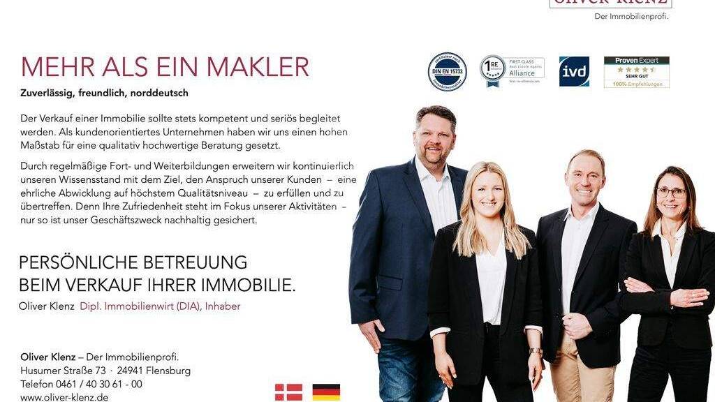 Gerne stehen wir Ihnen in unserem Geschäftsbüro in der Husumer Straße 73 in Flensburg beratend zur Seite. Unsere Büro-Öffnungszeiten sind Montag - Freitag von 9.00 Uhr - 18.00 Uhr und nach telefonischer Vereinbarung. Sie erreichen uns telefonisch unter 0461 / 40 30 61-00 oder besuchen Sie uns auf unserer Website unter www.oliver-klenz.de