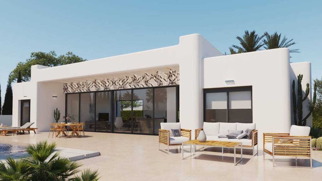 Dieses besondere Villenmodell hat ein spezielles "Ibiza"-Design und -Stil. Das Innere Layout ist alles auf einer Ebene und besteht aus einem hellen und geräumigen offenen Wohn- und Essbereich mit großen Fenstern im gesamten Raum rühmt viel natürliches Licht und Öffnung auf der Terrasse und Garten, eine voll ausgestattete moderne amerikanische Küche mit Mittelinsel, Hauswirtschaftsraum, eine Gästetoilette, eine beeindruckende Master-Suite mit einem großen Schlafzimmer, en-suite Badezimmer und begehbaren Kleiderschrank / Ankleidebereich, die Villa wurde entwickelt, um die Master-Suite auf der einen Seite der Villa zu haben, um zusätzliche Privatsphäre zu schaffen, sind zwei weitere Doppelzimmer auf der anderen Seite der Villa, die beide en-suite Badezimmer haben. Der weitläufige Außenbereich des Anwesens ist perfekt, um das Leben im Freien in dem schönen Klima zu genießen, mit Chill-out-Zonen am privaten Swimmingpool und Bereichen für Mahlzeiten im Freien mit Familie und Freunden.