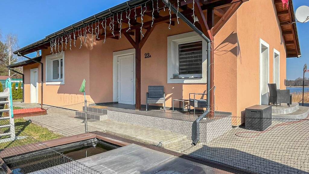 .Bungalow (ebenerdig, keine Treppen) .Baujahr 2020 .ca. 115 m² Wohnfläche .ca. 491 m² Grundstück .4 Zimmer .Großzügiges Wohnzimmer mit Terrassenzugang .Moderne Einbauküche mit Essbereich .Badezimmer mit Badewanne und Fenster .Fußbodenheizung im gesamten Haus .Hochwertige Fliesen in allen Bereichen .Gaszentralheizung .Komplett möbliert .Terrasse .Whirlpool im Außenbereich .Koiteich (kindersicher gestaltet) .Wasserblick .Privater Zugang zum See .Ruhige, naturnahe Lage .Alarmanlage mit KI-Kameras .Gehobene Ausstattung