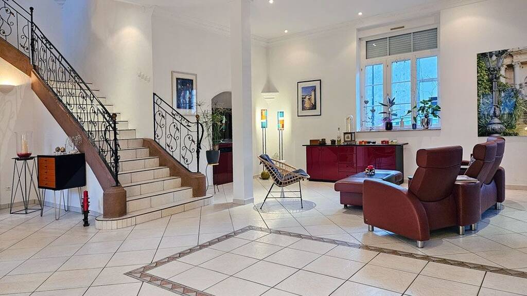 Das Haus verfügt über 7 Zimmer; im Erdgeschoß Fußbodenheizung, hochwertig geflieste Fußböden und eine Einbauküche im Landhausstil. Dazu kommt ein Heizungsraum und ein Lagerraum zur Straße hin. Eine zentrale Staubsaugeranlage und vier KFZ Stellplätze sind vorhanden. Im EG und im OG befinden sich jeweils ein Bad und ein Gäste-WC. Das Haus ist rundum in einem sehr gepflegten und umfangreich sanierten Zustand.