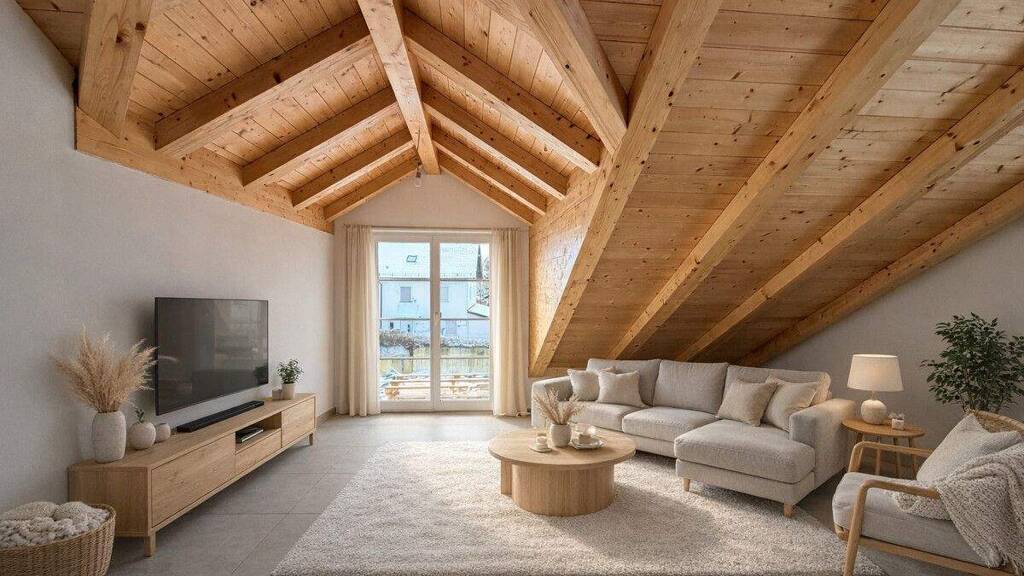 Das absolute Highlight der Wohnung ist der großzügige Wohn- und Essbereich mit integrierter Küche. Die sichtbare Holzdecke, die charakteristischen Dachschrägen und der auskragende Zwerggiebel verleihen diesem Raum eine besondere Atmosphäre und sorgen für ein behagliches Wohngefühl. Durch den Zugang zum Balkon öffnet sich der Raum zusätzlich nach außen und bietet einen schönen Blick ins Freie. Hier entsteht eine echte Wohlfühloase, in der Wohnen, Kochen und Essen harmonisch miteinander verbunden sind.