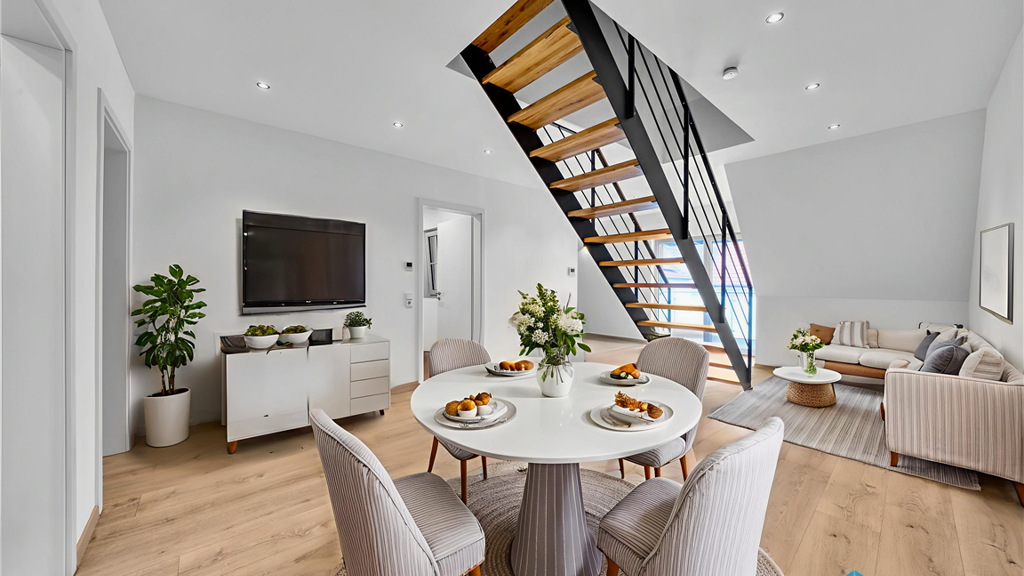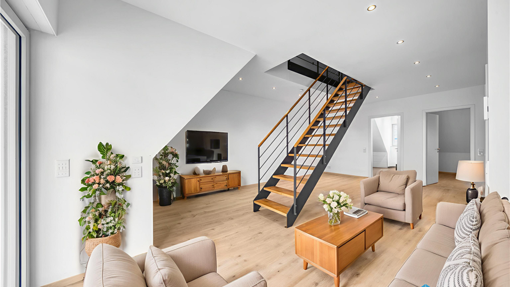 Das Dachgeschoss überzeugt mit einem Galerieraum, Schlafzimmer, einem zweiten Badezimmer mit Dusche und Wanne, sowie einem weiteren Balkon. Über eine elegante Treppe erreicht man den ausgebauten Spitzboden, der sich ideal als Büro, Studio oder Gästezimmer eignet.
