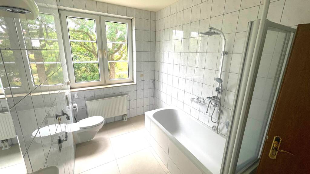 Nach Durchschreiten des hellen Treppenhauses kommen Sie zur Eingangstür der sonnigen-Wohnung im 1. Obergeschoss. Der kleine Korridor leitet Sie in alle Zimmer der Wohnung über in die das Wohnzimmer und die Essküche mit Fenstern und einen schönen Fliesenspiegel, das Wannenbad ist komplett gefliest, im Bad sind Badewanne, Waschbecken, Toilettenbecken, Waschmaschinenanschluß und ein Fenster vorhanden. Alle Zimmer haben einen Laminatfußboden und sind Rauhfaser weiß tapeziert, des weiteren verfügen die Wohnräume über Kabelrundfunk mit Anschlüssen ebenso Telefondosen. Ein Kfz - Stellplatz befindet sich direkt am Haus. Entspannt parken - ohne Suche - , ausladen und ausspannen! Hier wohnt man herrlich!